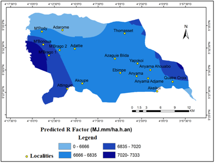 Predicted map of rainfall erosivity for 2045: The erosivity map shows that the town of Anyama is subjected to rain aggressiveness. The R factor values ranging from 0 to 7333 Megajoul.mm/hectare.hour.year with an average of 4013.66 Megajoul.mm/hectare.hour.year (Figure 8). The predicted map of rainfall erosivity for 2045 shows variations of rainfall. The highest values vary between 7020 and 7333 Megajoul.mm/hectare.hour.year are recorded to the west and the EST of the study area. These values occupy 1801.26hectares which is equivalent to 4.25% of the town. 16.18% or 6854.31hectares of territory is subject to a correspondingly high climatic aggressiveness to an R factor class between 6835 and 7020MJ.mm/ha.h.y and are located in the West, the Southwest, to the east and north. More than half 65.62% of the study area with an area of 27803.16hectares is subject to erosivity 6667 to 6835 shows a moderate MJ.mm/ha.h.y erosivity. The lowest R values presented by the class 0 to 6666 MJ.mm/ha.h.y focus in the North and East.