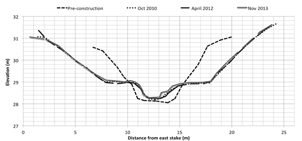 Figure 4 Two-stage ditch construction in Mower County, MN7 showing the pre-construction ditch and TSD design with a small floodplain (with vegetation) that when harvested provides nitrate and phosphorus removal.