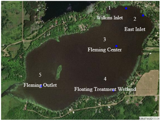Comprehensive water sampling at Fleming Lake was performed twice: once on July 17th 2019, and again on August 29th 2019. Five sample sites were arrayed at points of interest within the lake; the two inlets, the outlet, the approximate center of the lake or deepest portion, and adjacent to FTWs, see Figure 5). Turbidity data for Fleming Lake as well as land cover data was sourced from the Minnesota LakeBrowser developed by the University of Minnesota’s Remote Sensing and Geospatial Analysis Laboratory in collaboration with the Water Resources Center (University of Minnesota, 2018). Measurement of pH, SC, turbidity, and DO were done on-site using the YSI 6820 sonde. Samples were taken directly below the surface using 1-L HDPE bottles.