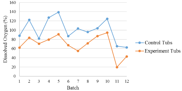 The average DO percent saturation in experiment tubs was 68.66% ± 20.71%. Experiment tubs never exceeded 100% DO. Control tubs had a higher average DO percent saturation, 99.99% ± 23.61%. The differences in DO percent saturations were statistically significant (p = .00556).