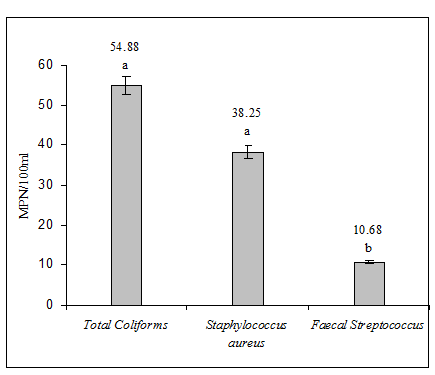 Hotels and restaurants: Samples taken from different hotels and restaurants were also free from faecal Streptococcus contamination. But a higher microbial count was determined for the presence of Coliforms and Staphylococcus aureus. The microbial counts of total Coliforms and Staphylococcus aureus in water samples taken from hotels and restaurants were found to be 57.67 MPN/100ml and 16 MPN/100ml respectively (Table 1).
