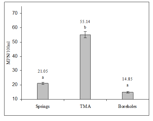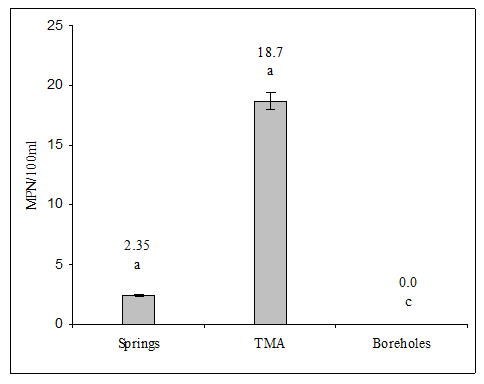 ANOVA was performed to assess the significance of microbial concentrations in different water supply systems and resources. Three major water sources (TMA Supply, ICI outlets and natural springs) were subjected to statistical analysis i.e. TMA supply, natural water springs and private boreholes. According to the data obtained, there was no significant difference between the three water resources (Natural Springs, TMA supply, ICI outlets & Boreholes) regarding contamination of drinking water with total Coliforms group (Figure 4). The p-value for analysis between springs and TMA supply was 0.32, between TMA Supply and Boreholes was 0.17, and between springs and Boreholes was 0.3 (Figure 4). However, a significant difference was observed between springs and TMA supply regarding microbial counts of Staphylococcus aureus (p=0.038). The counts of Staphylococcus aureus were also found significantly different in TMA supply and boreholes (p=0.0074). However, no significant difference was observed in the mean counts of springs and boreholes (p=0.3089) (Figure 5). On the other hand, there was no significant difference observed among counts of faecal Streptococcus in samples from springs and TMA supply line (p=0.055). However, there was a significant difference among the samples from TMA supply and private boreholes (p= 0.03). No such difference was found in the microbial concentrations in samples of springs and boreholes (p=0.059) (Figure 6).