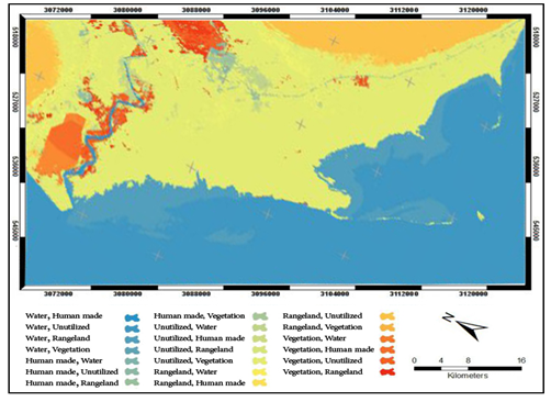After examining the changes, it is evident that the process of changes has increased the use of unutilized (51.27%) and the reduction of the use of vegetation (the original reduction was the most significant compared to the rest of the uses 81.77%) and the increase in human-made use (31.27%) and decreased pasture use (10.66%). And the values for user area changes are given in user modifications. According to the breakdown table of applications, the largest change in vegetation to unutilized and Water is to beer and human-made to unutilized and Range to unutilized and unutilized to human beet breeding and shrimp, and a full description of all the conversions between the use of the existing in the period from 2011 to 2017 is broken down in Table 4. Changes that occurred during the time interval are based on the location of the changes in the Figure 4. The total user changes are 1268.53 Km2.