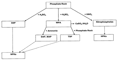 There are two types of phosphate processing: The wet processing and dry thermal processing. The wet processing, done with Sulfuric acid, is the most used method for more than 90% of the phosphate fertilizer production. The reaction of calcium phosphate with sulfuric acid leads to different products depending upon the relative amount of Sulfuric acid added to the phosphate ore (Figure 2): the first reaction used produce SSP; the second reaction used to produce WPA; the third reaction used to produces TSP; if phosphoric acid is neutralized by ammonia, the fourth reaction can lead to the production of MAP and DAP etc. Phosphogypsum is the byproduct in wet processing. Generally, 4-5 tons of phosphogypsum are produced per ton of phosphoric acid (P2O5).31