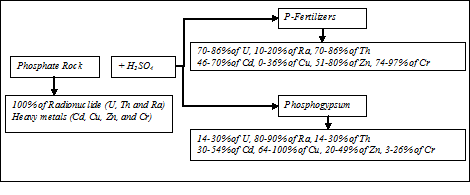 The radioactivity of phosphate rock was probably first observed in 1908, when the British physicist R. Strutt found that samples of phosphorite were many times more radioactive than the average rocks of the Earth's crust.23 The dominant radioactivity detected in phosphate rocks are uranium, thorium and their decay products in equilibrium with their respective parent elements in the ore.24 The Uranium series includes 238U, 234Th, 234U; 230Th; 226Ra, 222Rn, 210Pb, 210Bi and 210Po, Thorium series includes 232Th; 228Ra, 228Ac; 228Th, 224Ra, 220Rn, 212Pb, 212Bi. Of all the radionuclides in phosphate rock, 226Ra is of particular interest because of its long half-life, radiotoxicity and its relative physical and biological mobility. The nuclide is of further importance as the parent nuclide of the gaseous 222Rn which, along with its solid decay products, constitutes a significant source of radiation exposure. Concentrations of 226Ra in phosphate rock are reported to vary, covering a range of 1-2 Bq/g.25‒29 Most of the 226Ra in the ore ends up in the waste phosphogypsum during the production of phosphate fertilizers. The concentration of 226Ra in these wastes is reported to be nearly 1Bq/g.25,27