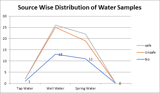 A drinking water quality investigation of Jageer Katkair Muzaffarabad has been done a total of 25 erratic examples were assembled from springs, Bore, and well water. Standard strategies and shows were set for the grouping of water examinations, recording, and association of data surveys of water tests and improvement of GIS information collection for DWSS (Table 1), Graph 1 and spring water quality outline of the town of Jageer Katkair in Muzaffarabad, AJK. Evaluation of any water tests begins appropriately at the site. During testing, one prerequisite is to reveal remarkable thoughts to block the interference of any external parts that could change the formation of an example and affect the results. Water tests for physicochemical examinations were assembled in polystyrene compartments with a 1-liter breaking point. The table underneath shows the source-wise circulation of water tests. Before analyzing, the containers are washed thoroughly 2-3 times, first with water and then a short time later with refined water. For bacterial assessment, tests were accumulated clearly in cleaned holders outfitted with a field-testing pack (water check, ready faction, MERCK). Boric destructive was used as an added substance in the inspecting bottles for nitrates and nitrogen before moving to the field.