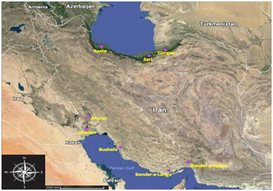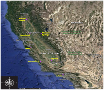 Studied sites and data: Daily climatic data as well as ET0 estimates from the PM equation were used to train, test, and validate the M5MT model. The training dataset consisted of data from eight coastal weather stations in Iran, collected from 2000 to 2007. The testing dataset contained data from the same eight stations, but for 2008. Performance of the M5MT models was validated with seven California Irrigation Management Information System (CIMIS) weather stations in 2015. CIMIS dataset was used for models validation to evaluate their feasibility in other regions, and examine whether they are applicable in areas that they were not trained in. Figure 1 & Figure 2 show the spatial distribution of the utilized weather stations in Iran and California, respectively. The recorded data consisted of daily average relative humidity (RHmean), and wind speed (Ws), daily maximum, minimum and mean air temperature (Tmax, Tmin, and Tmean), and incoming solar radiation (Rs). Table 1 lists the geographical coordinates of each weather station and the corresponding annual averages of the collected data. ET0 is the reference evapotranspiration (mm/d), Δ is the slope of saturation vapor pressure function (kPa/°C), Rn is the net radiation (MJ/m2day), Ra is extraterrestrial radiation (mm/d), G is the soil heat flux density (MJ/m2day), γ is the psychrometric constant (kPa/°C), Tmean is the mean air temperature (°C), Tmax is the daily maximum air temperature (°C), Tmin is the daily minimum air temperature (°C), Ws is the daily mean wind speed at a height of 2 m (m/s), RH is relative humidity (%), es is the saturation vapor pressure (kPa), and ea is the actual vapor pressure (kPa). The commonly used equations for the estimation of ET0 are presented in Table 2. Based on the proposed equations in Table 2 and the study conducted by,4 four input combinations were used to predict ET0. The following data configurations were used to train, test, and validate M5MT: