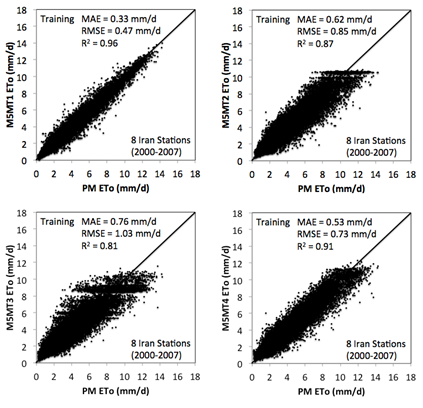 Performance of M5MT models in Iran (training and testing stages): Table 4 shows MAE, RMSE, and R2 of ET0 estimates from the four M5MT models for training and testing stages. The training process resulted in MAE, RMSE, and R2 values ranging between 0.33−0.76mm/d,0.47‒1.03mm/d, and 0.81−0.96, respectively. The testing stage showed similar values that ranged between 0.38‒0.77mm/d (MAE), 0.55−1.06mm/d (RMSE), and 0.80-0.95 (R2). It was observed that the presence or absence of certain input parameters influenced the performance of the models. Comparing the models with two input variables, M5MT3 (whose inputs were Tmean and RHmean) had higher MAE (0.76mm/d) and RMSE (1.0mm/d) than M5MT2 (whose inputs were Tmean and Rs) in the training stage. Solar radiation tends to have a greater effect on ET0, as replacing mean relative humidity by solar radiation increased accuracy in the training phase and decreased MAE and RMSE by 23% and 21%, respectively. This is in agreement with the results from the testing stage, in which a respective 20% and 15% decrease in MAE and RMSE was observed when solar radiation was used in lieu of mean relative humidity. Assessing the performance of the M5MT models with four input variables during the training stage, M5MT4 (whose inputs were Tmean, Tmax, Tmin and Ra) had larger MAE (0.53mm/d), RMSE (0.73mm/d) , lower R2 (0.91) values than M5MT1 (whose inputs were W2, RHmean, Tmean, and Rs). This is consistent with the testing phase because MAE and RMSE are decreased by 47% and 49% by using M5MT1 instead of M5MT4. Figure 3A & Figure 3B show estimated ET0 values from the four M5MT models versus PM ET0 estimates for training and testing stages, respectively. The concentration of data around the 1:1 line in Figure 3A & Figure 3B reflects the low RMSE values obtained in both training and testing stages. In general, the small MAE and RMSE and high R2 suggest that M5MT can accurately estimate ET0. Overall, the results in Figure 3A & Figure 3B and Table 4 indicate that the combination M5MT1 provided the most accurate ET0 estimates during the training and testing stages. In the training stage, MAE (RMSE) of ET0 estimates from M5MT1 were respectively 88% (81%), 130% (119%) and 61% (55%) lower than those of M5MT2, M5MT3 and M5MT4. A similar tendency was seen in the testing stage with MAE (RMSE) values of M5MT1 were 68% (67%), 103% (93%), and 47% (49%) lower than those of M5MT2, M5MT3 and M5MT4, respectively.