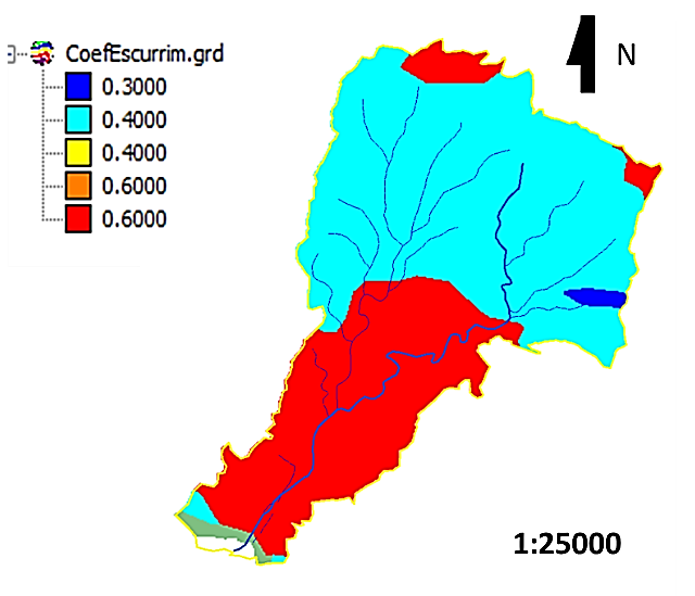 In the study area, 8 rainfall stations were identified near the chosen watershed, although there are others whose records were taken into account for the elaboration of the provincial and national isoetic map, which were finally used in the research for the spatial modelling of the average rainfall annual (Figure 7). For the delimitation of the slopes and determination of the average slopes (Table 5), the slope model was obtained from the delimitation with the use of the Digital Elevation Model (DEM) at a scale of 1: 25000, then the model of mean slopes for processing in the GIS in the same closures chosen above. For the proper selection of the runoff coefficient, the type of basin was taken into account, with the results of Table 6, in correspondence with these values the runoff coefficient model of Figure 8 was obtained.