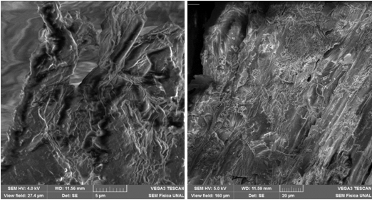 Figure 1 shows the microphotographs of the surface of the BPRC, which show the structure and porosity characteristic of this type of material. In this analysis of the active sites, it was found that the material has acidic characteristics. According to this result and following Boehm,13 it could be said that the surface of the BPRC has carboxyl groups (RCOOH), carboxylic acid anhydrides ((RCO)2O), lactones (RCOOR), lactols (RCOOOH) and phenolic hydroxyl groups (ROH).