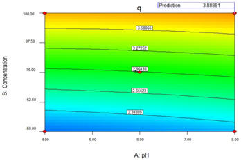 In order to analyze the influence of pH factors and initial concentration of Cadmium (Cd2+) on the efficiency of the biosorption process, an experimental design of composite central type was proposed. The pH of the aqueous solution was adjusted to levels 4 and 8 and the concentration of cadmium (Cd2+) in solution was adjusted to values between 50 mg L-1 and 100 mg L-1. All experiments were performed in batch mode. Table 1 shows the analysis of variance that indicates the most influential parameters in the process. All factors or interactions among themselves that obtain a probability value P <0.05 (last column of Table 1) are considered the most relevant in the adsorption process. In this case, factors A and B are the most significant.