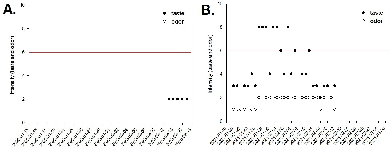 Figure 2 Data of the maximum intensity found for the parameters "Taste and Odor" in the Distribution Network for the five days in the 2020 crisis (A) and for the 29 days in the 2021 crisis (B), analyzed and presented in the tables available online. The red line represents the maximum permitted value (MPV) described in the Brazilian legislation.