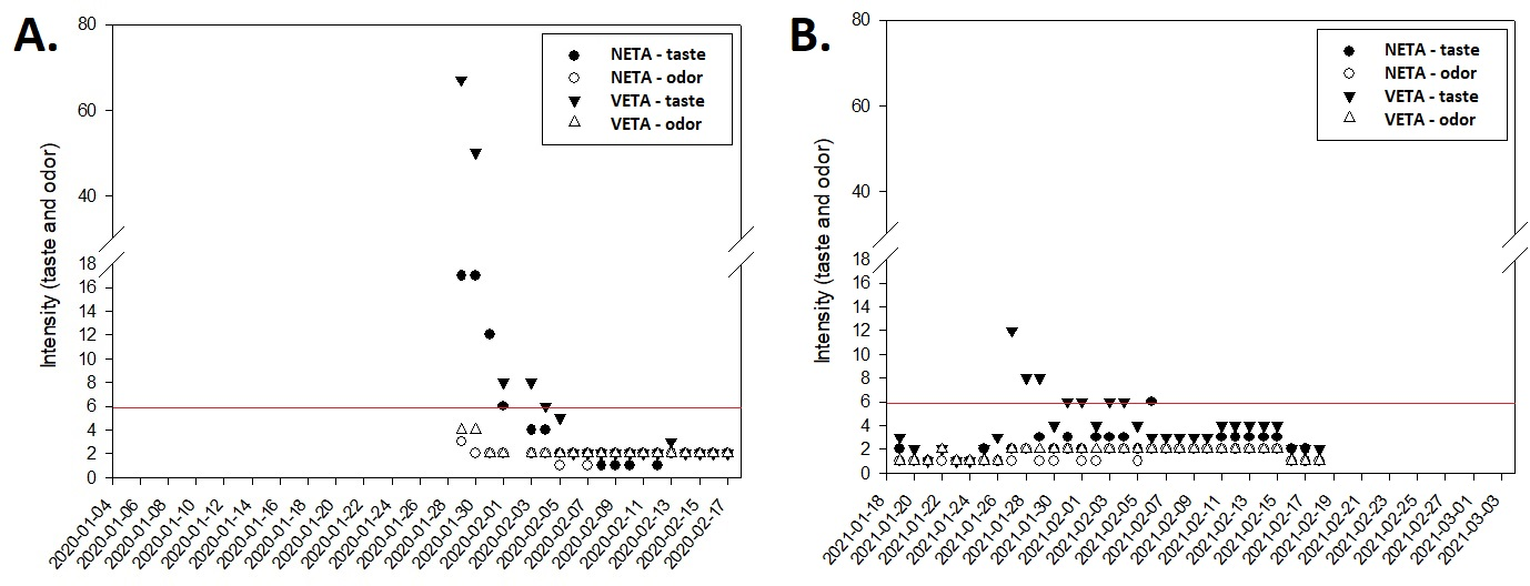 In 2020, after 24 days of facing the situation of supply of drinking water with taste and odor, the intensity of the standard organoleptic taste, both in the output of the VETA and NETA, was well above the MPV Figure 3(A) described in the potability legislation.19 In the year 2021, only after seven days of complaint of the supply situation with taste and odor, the analyses of the contracted company were performed and showed values above the VMP Figure 3(B). However, when comparing the data from the NETA outlet with those from the VETA outlet, the water produced at VETA presented most of the time intensity of the parameters with higher values. In 2020, the maximum values for taste intensity at VETA and NETA was 67 and 17, respectively. In the year 2021, the amplitude of the data for VETA and NETA was 11 and 5, respectively. However, both treatment plants collect raw water from the same source.