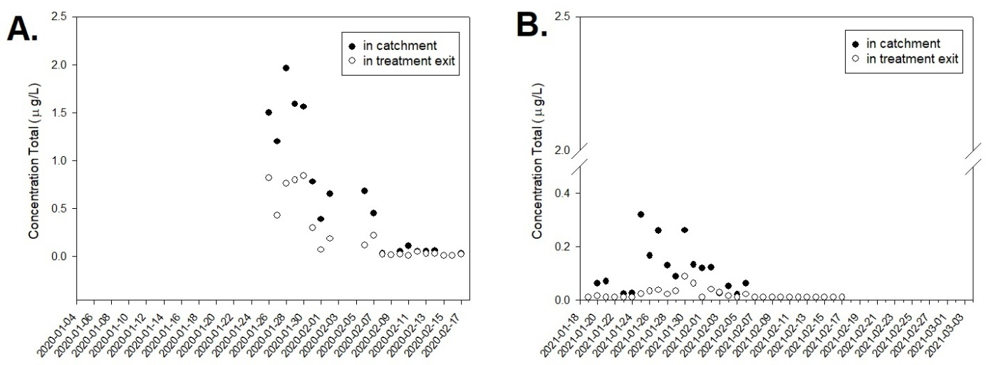 Figure 4 Monitoring of the total concentration of 2-MIB and Geosmin, in the Guandu System, within the period analyzed for the 23 days of the water crisis in the year 2020 (A) and 33 days in the year 2021 (B); at the raw water intake and treatment output points.