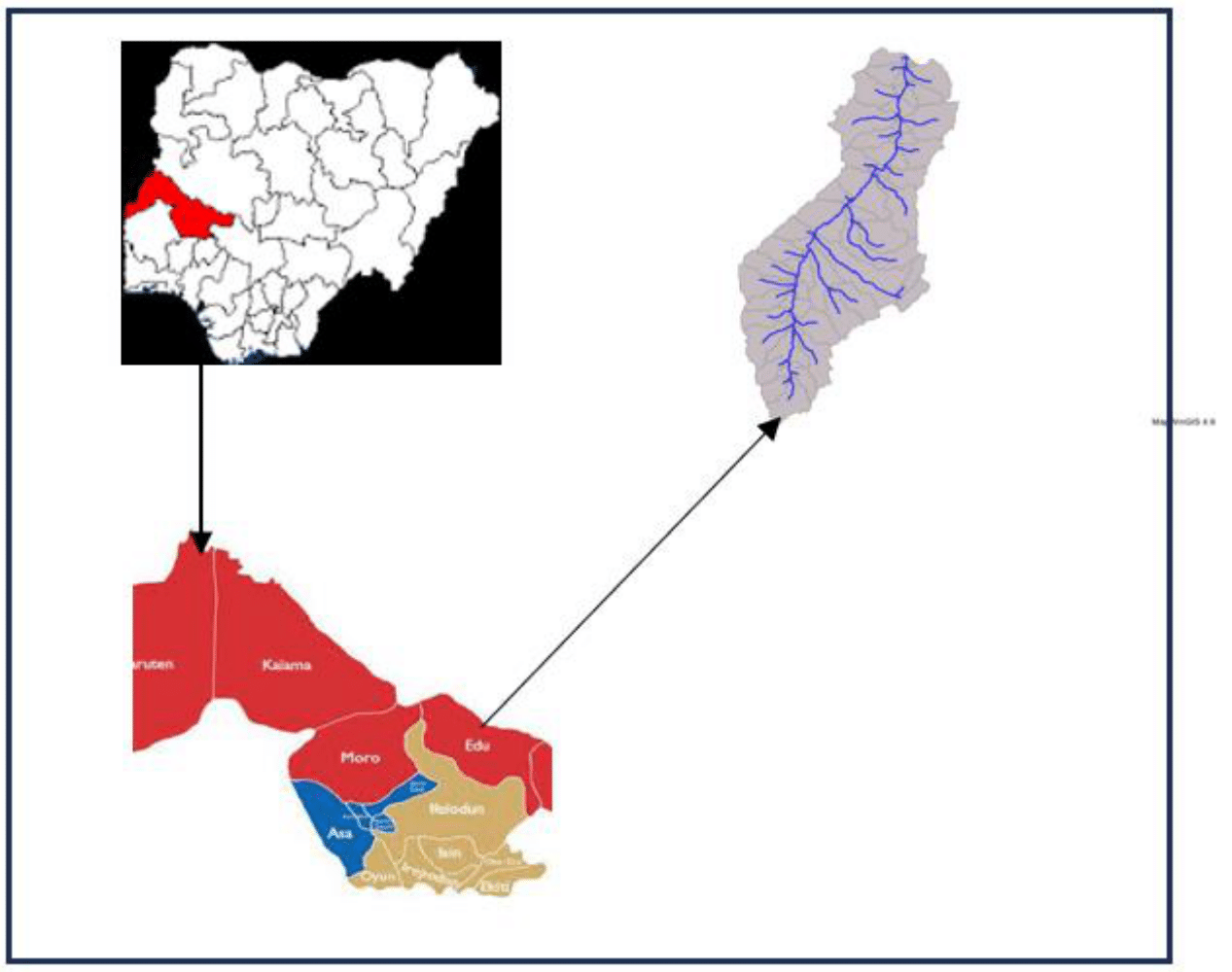 Asa River originated from Oyo State, Nigeria which is the largest river that flows through the city of Ilorin, Kwara State, Nigeria in a South-North direction establishing a dividing boundary between Eastern and Western Ilorin. Asa River is 56 km long, with a maximum width of about 100 m (at the dam site). Asa River has its inlet at River Awon, which is one of the tributaries of River Niger, at 12,200 m North of Ilorin. It is merged with River Imoru and to the East by River Oyun. Afidikodi, Ekoro, and Obe are among the earliest tributaries of the Asa River while its tributaries in Ilorin include River Osere, Atikeke, Okun, Odota, Agba, and Aluko. Also, the Asa River is about 1040 km2 in area and lies between latitudes 8036′N and 8024′N and longitudes 4036′E and 4010′E.11,13 The map of Kwara state showing the study area is presented in Figure 1 and 2 respectively.