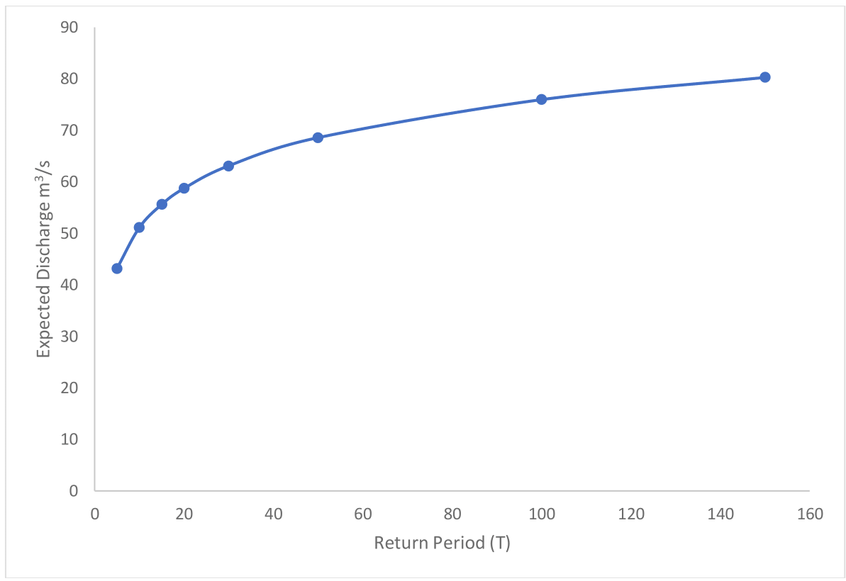 The Flood Frequency Analysis of Asa River was done following the above procedure and the results obtained are shown in Table 1. Also, a plot of reduced variate against flood peak discharge was plotted for the Asa River, which is shown in Figure 3. However, the expected flood discharges of the study area for return periods of 5 yrs, 10 yrs, 15 yrs, 20 yrs, 30 yrs, 50 yrs, 100 yrs, and 150 yrs, were estimated to be 43.19 m3/s, 51.12 m3/s, 55.60 m3/s, 58.73 m3/s, 63.11 m3/s, 68.58 m3/s, 75.96 m3/s, and 80.27 m3/s respectively.