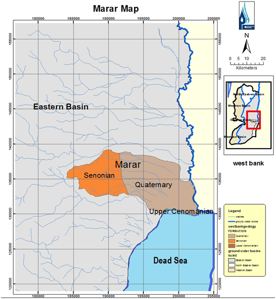 Marar catchment is located in an arid to semi-arid region where the conservation of water resources is not significant. The increase in demand for water in Marar catchment should lead to the implementation of high intensive water management measures to achieve efficient utilization of the limited available water supplies. Marar catchment’s steep slopes and geology make it among the most likely in the West Bank to experience floods. Floods flow with high speeds and in large quantities without human benefit is one of the major concerns to be taken into consideration. Studying the hydrological, hydrogeological, geomorphological, and water balance of the catchment will help in choosing the appropriate method for solving the flood problems in the area. The area of the study lies in the eastern part of the West Bank and located within structural and hydrological boundaries. The main recharge sub-basin for this system is the Jerusalem-Ramallah Mountains in which runoff water drains through wadi’s flow from the west to the Jordan Rift Valley in the east.