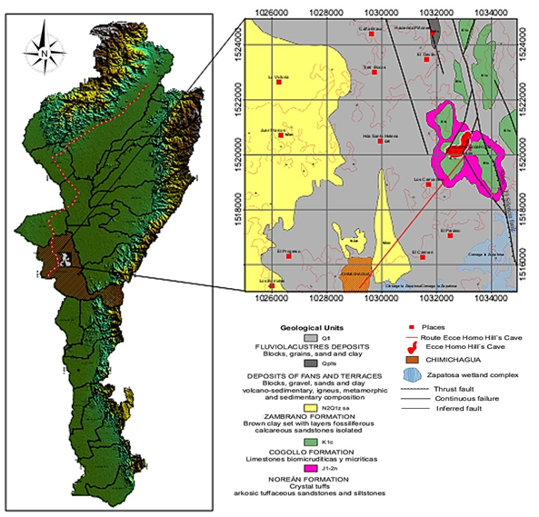 The Ecce Homo Hill´s Cave is developed entirely within the associated with carbonated rocks of the Aguas Blancas Formation belonging to the Cogollo Group. These rocks probably deposited in a shallow marine platform environment, due to the presence of foraminifera that they would indicate a depth no greater than two hundred meters. It contains different types of pavillian, paving and zenith speleothems of different sizes in the galleries, being this the tourist attraction of such cavity, such as columns, moonmilk, stalactites, castings, sawtooth, gours and flags. In this cave inhabit colonies of bats, mice, spiders, cockroaches, among others, which could be endemic species of the area and nourish the biodiversity of Colombia. The genesis of these cave is related to leaks of water loaded with CO2. This mixture forms carbonic acid, which reacts with CaCO3, the main chemical constituent of limestones. This process was expanding the fissures present in the rocky massif to give it the shape it has in the present. Muddy sediments are found on the floor of the cave, which are waterproof, preventing the continuation of decrease in H2CO3 filtering through cracks. Upon encountering this impermeable rock, the H2CO3 begins to move horizontally, forming the current galleries and steps of the Ecce Homo Hill´s Cave. It can be catalogued as a punctual Geosite with geomorphological interest, taking into account the large number and variety of speleothems presented as well as its excellent state of preservation.49