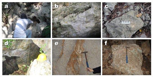 Figure 2 Field photographs of the Ecce Homo Hill lithological features. (a) Calcareous strata of the Aguas Blancas Formation (Cogollo Group) displaying carbonate dissolution; (b) calcareous and fossiliferous strata; (c) fossiliferous limestone with shell fragments; (d) fractured calcareous strata at the entrance of the cave; (e) fracture filled by carbonates inside the cave; (f) fallen calcareous block showing bioturbation inside the cave.