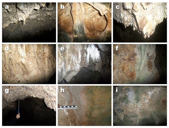 Figure 4 Field photographs of the speleothems at the Ecce Homo Hill´s cave. (a) Conical stalactites; (b) column; (c) moonmilk (microcrystalline carbonate aggregates); (d) gours; (e) sawtooth; (f) casting due to surface washing; (g) nodular or globular speleothem (coralloids); (h) rootsicles (at the base of the photo) or outside plant roots; (i) flag.