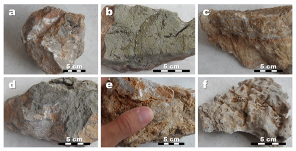 Figure 5 Photographs of hand specimens of rocks cropping out at the Ecce Homo Hill. (a) Mudstone with veinlets of calcium carbonate; (b) mudstone with shell fragments up to 2 mm; (c) acicular and banded carbonates; (d) massive mudstone; (e) concentric structure of calcium carbonate; (f) mudstone showing dissolution.