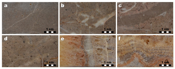 Figure 6 Photographs of polished specimens of rocks: (a) mudsoported limestone (mudstone) with low fossiliferous content; (b) limestone of mudstone type with vein of recristallized CaCO3; (c) mudsoported limestone with pellets and vein of recristallized CaCO3; (d) mudstone with pellets and recristallized CaCO3 shells; (e) calcite developing banded (in the central part) and acicular (in the ends) aggregates; (f) calcite with banded and concentric structure (in the central part) with oxides.