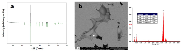 Figure 8 (a) XRD pattern of a speleothem composed by calcite. (b) SEM image and EDS analysis of a speleothem.