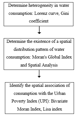 The analysis was carried out in three steps as indicated in Figure 1. The first step measures the degree of inequity in family water consumption among households, estimating the Lorenz curve and the Gini coefficient.