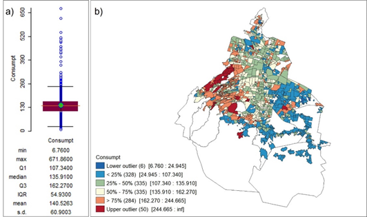 In this section, the presence of a spatial pattern is explored through the exploratory spatial data analysis using the box plot and two georeferenced maps, corresponding to two classifications of consumption. The box plot and the first map show the statistical variability and spatial trend of water consumption ordered in quartiles from lowest to highest per capita water consumption considering its oscillation within the median and mean of the data (Figure 3).