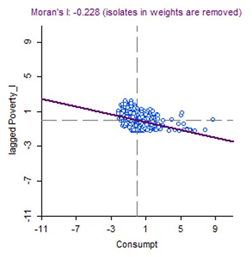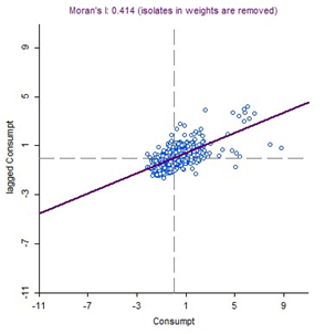 The first and third quadrants register positive spatial autocorrelation, the consumption of neighboring households located in these quadrants are similar. Households with high consumption are autocorrelated in the upper right quadrant, while low consumption households are autocorrelated in the lower left quadrant. In contrast, in the second and fourth quadrants the consumption of neighboring households differs, and there is no spatial autocorrelation between them.