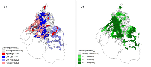The Lisa Index Map identifies the areas of the city with a high correlation between households with a low level of water consumption and housing location in highly poverty areas. This region is located on the southeast outskirts of the city. The central and west regions have the highest water consumption per household, these regions are characterized by a very good socioeconomic condition. Other areas with average poverty revealed a medium range of water consumption and suggests a socio-spatial transition between the peripheral and central areas with a higher socioeconomic level.