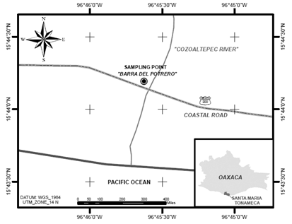 It is located in the coordinates 15° 44’ 23.00’’ N and 96° 45’ 40.8’’ W, at an altitude of 59.1 masl. The experimental lands are located six km northeast of the “La Salina” lagoon, and of the town of “Escobilla”, in the property known as “El Potrero” jurisdiction of Santa María Tonameca, Oaxaca (Figure 1). The weather is warm sub humid, with rains of least humid in summer Aw0 (w). The average annual temperature is 27.4°C, dropping to 25.5°C in January the coldest month, and rising to 29.4 °C in May, the hottest month. The average annual variation in temperature is 3.4°C. Total annual rainfall is 1057.8 mm. The driest month is March, with 1.4mm of rainfall, and the most humid month is September, with 255.2 mm.7 The lands are foothills with slopes close to 25%, whose soils are a result of the weathering of metamorphic rocks from the Paleozoic era, which are a part of the Xolapa geological complex.8 Soils are classified as eutric regosols with a sandy loam texture and a massive structure.9 They have a low percentage of clays < 10% and kaolinite is the main mineral colloidal component.7 These soils sustain a deciduous forest vegetation under conditions of intense disturbance due to deforestation caused by changes in soil used to clear lands for agriculture and extensive livestock farming. Downstream, in the coastal plain, there are patches of mangrove and secondary vegetation as a result of human activity.10 The secondary vegetation that grows and develops in the area includes shrubs such as (Calycophyllum candidissium), huizache (Acacia farnesiana), horns (Acacia Cornigera), leadtree (Leucaena leucocephal), manjack (Cordia dentata), bloodwood (Lonchocarpus constrictus), false tamarind (Lysiloma mycrophyllum), beach manzanilla (Crataeva tapia), spoon stick (Cochlospermum vitifolium), cedar (Guazuma ulmifolia) and cocuite (Gliricidia sepium).11 Near of the evaluation site runs the Cozoaltepec river, which drains the western area of the coastal valley of the Tonameca basin (Hydrological region 21 Coast of Oaxaca). The Cozoaltepec river is formed with water from the Sapo river, which is born in San Agustín Loxicha. It presents runoff in the rainy season of 142.90 m3 and a downstream runoff of 142.65m3. Its development is short, and in the rainy season it carries a considerable volume of water.7