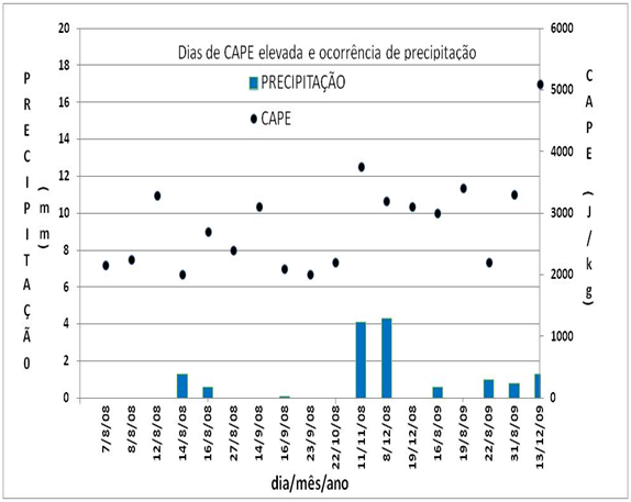 The analysis of precipitation variation, CAPE and ISCED in the period between August 1, 2008 and December 31, 2009 is made in this chapter. This analysis sought to determine the influence of thermodynamic conditions on the occurrence of extreme precipitation events in the city of Belém and the metropolitan region. The results show that, not always, high values of CAPE were related to the occurrence of precipitation, as shown in Figure 3. In these cases the absence of precipitation occurred due to the lack of a strong enough dynamic mechanism to raise the air parcel from the surface to the NCE causing the convection to be fired. It was observed that in order to generate rain, due exclusively to thermodynamic factors, it is necessary that the CAPE value be higher than 2000J/kg. The results are similar to the conclusions obtained by Mota & Nobre,14 when they did the CAPE analysis for the State of Rondônia, and found that the CAPE should be above 4000J/kg so that deep convection and precipitation could occur in the absence of the dynamic forcing. In the studied period, extremes of precipitation occurred with low CAPE values, in this case, precipitation extremes occurred due to the dynamic breeze effect, which formed lines of instability along the coast of Belém generating strong precipitation in the region, as discussed by Gamache & Houze,21 Garstang et al.,8 Cohen et al.,7 Alcantara et al.,22 The presence of the Intercropical Convergence Zone (ITCZ) in the study region and cold fronts in southeastern Brazil also influenced the variability of the precipitation in Belém, as they contributed to the increase of convergence at low levels and to the increase of humidity in atmosphere. These results are similar to those found by Xavier et al.,18 for the catchment area of Ceará and for Tavares & Mota,16 for the city of Belém and the metropolitan region. The ZCIT, a large-scale dynamic forcing, intensifies convection and generates severe storms, which causes great material damage to society. It was also observed in this study that low values of ISCED do not determine precipitation occurrence, and that if the thermodynamic effects are associated with the dynamic effects, the amount of precipitation occurred in the studied region will be greater than that associated with these factors acting individually.
