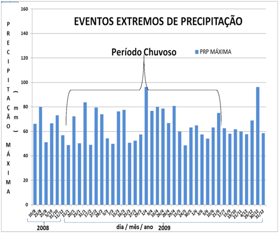 Figure 4 shows the total accumulated monthly rainfall (spatial mean of collection points) in the analyzed period, for the city of Belém and the metropolitan region. It is observed that a greater amount of precipitation occurred between the months of January and June of 2009, and the maximum occurred in March (354mm). This period with the greatest amount of monthly total precipitation (spatial mean of collection points) was called, in this research, "rainy season". The influence of the ITCZ in the region is due to the variation of the radiation received by each hemisphere, so that from September, the ITCZ is moving from the northern hemisphere to the southern hemisphere.23 The period of least total monthly rainfall (mean of collection points), called the dry period in this work, occurred between July and December of the years of 2008 and 2009. Given that the lowest total monthly rainfall (spatial average of points of collection) occurred in November 2009 (49mm). In Figure 5, forty-two (42) extreme precipitation events (> 47.9mm for the sample analyzed) were observed, both in the rainy season and in the dry season.