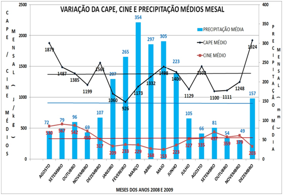 The average monthly variability of CAPE, ISCED and monthly total precipitation (monthly spatial average of collection points) is presented in Figure 6. It can be observed that CAPE behavior in the dry period (July to December) was similar to the rainy season (January to June), since in both periods there were lower values than the average of all studied period (continuous black line - 1,350J/kg). The monthly average CAPE values for the dry period were not always higher than the monthly average CAPE of the rainy season, as can be seen in November / 2008 (1,200 J / kg), July / 2009 (1,130 J / kg / kg / kg / kg / kg / kg / kg / kg / kg) and dry weight (kg / kg) ), May / 2009 (1,500 J / kg) and June / 2009 (1,410 J / kg) of the rainy season. The results found in this paper differ from Tavares & Mota,16 since the analysis presented here refers to the monthly average of CAPE and not to the absolute daily values of CAPE, which were related by the author when comparing the occurrence of one extreme event in the dry period with that of the rainy season. So, the monthly variation of CAPE was significant, independent of dry and rainy periods, with values between 900J/kg (minimum) and 1900J/kg (maximum). Characterizing the strong convective activity throughout the year, in the tropical region, mainly in the Amazon, because even with small CAPE, nevertheless, it represents convective activity.