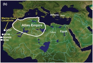 Atlantis is commonly viewed as a fictional island mentioned in an allegory on the hubris of nations in Plato’s works Timaeus and Critias, wherein it represents the antagonist naval power that besieges ancient Athens, the pseudo-historic embodiment of Plato’s ideal state in The Republic.1 The Atlantis story has many connections with the Mediterranean (especially Greek) myths and Egyptian cultures. In the early days of Egyptology it was thought that Egypt was simply a gift of the Nile. After the 1980s, archaeological excavations in Egypt’s Western Desert began to clearly identify the ‘Saharan affinities’ of the Pre-dynastic Egyptians. Friedman2 believes that Egypt and Nubia were also ‘gifts of the desert.’ Plato describes Atlantis to have ruled Libya as far as to the borders of Egypt.3 That means Atlantis must have been located west of Libya, and Libya itself must already have been part of the Atlantean territory. Based on water cycle stability and paleoclimate data, Zhang4 reconstructed the desertification process in North Africa following the green Sahara – an abrupt dry out in the Atlas Basin and a gradual desert expansion afterward powered by trade winds and westerlies. With the gradual desert expansion from northwest to southeast, people living in the Sahara were squeezed to the Nile valley. The population conglomeration gave birth to the dynastic Egyptian civilization which started about 5000 years ago, shortly after the end of the last green Sahara.