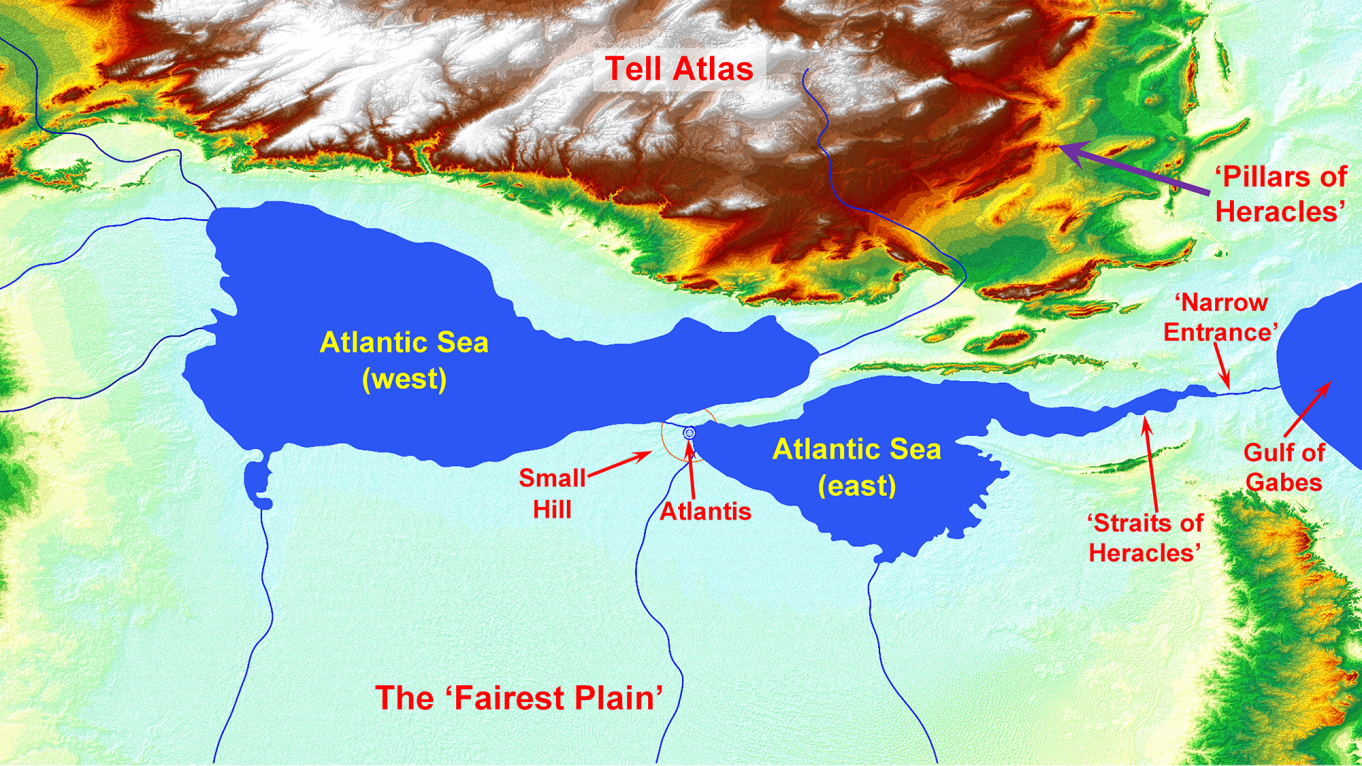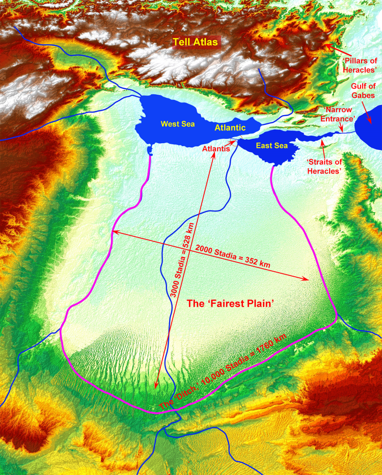In Plato’s Critias, the descriptions of the land profiles around the Atlantic Sea perfectly match the land profiles we see in AB. On the north side the ‘very lofty and precipitous’ area is the south slope of the Tell Atlas mountain. On the south side, “…the country immediately about and surrounding the city was a level plain, itself surrounded by mountains which descended towards the sea; it was smooth and even, and of an oblong shape, extending in one direction three thousand stadia, but across the center inland it was two thousand stadia. This part of the island looked towards the south, and was sheltered from the north.”