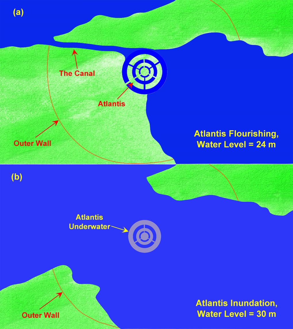 The European and African tectonic plates collide across AB and the Mediterranean area. The collision accumulates a great amount of energy, and this energy is released through earthquakes from time to time. This was likely the cause of the ‘misfortune’ for both Atlantis and Athens about 11,000 years ago. A powerful earthquake could have caused widespread structure collapse and massive casualties in the Mediterranean area. The consequent high Tsunami would submerge the coastal areas of Athens and other nearby countries, claiming more damages and human lives. This same earthquake could also have triggered a landslide at the ‘narrow entrance’ and blocked the water outflow (Figure 4). The ‘narrow entrance’ is a small gorge at the Atlantic Sea outlet formed by water erosion and dredging, about 30 meter deep. The blockage and the continuous inflow would quickly raise the water level of the Atlantic Sea to a height to submerge the island city Atlantis. The water level rise was likely accelerated by floods from upstream rivers due to heavy rainfalls. The water level rise was probably 5 to 7 meters. Figure 6(a) shows the land and water surface area around a prosperous Atlantis corresponding to water level 24 masl (meter above sea level) based on the present Earth surface profile. Figure 6(b) shows the same area flooded and Atlantis submerged by a water level of 30 masl. After the inundation, the area became a muddy shoal only several feet below the water surface, making the area “impassable and impenetrable.” This water area was the connection between the west sea and the east sea. The subsidence of the debris blocked the waterways in and out of this area, making it difficult to identify a navigable path.