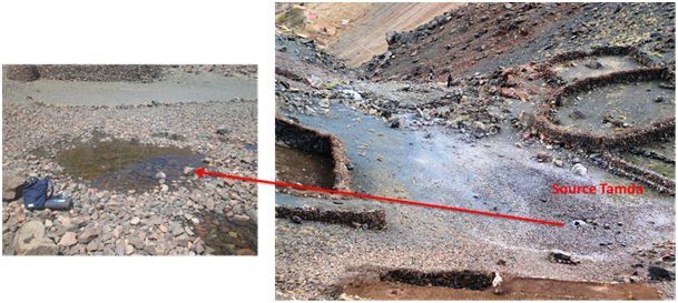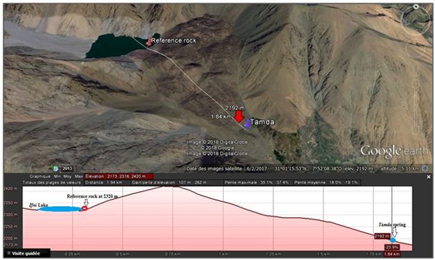 We find the very important water resources in the high valley of Tifnoute, springs and surface waters. Ifni Lake is the natural dam of water in this area, which alimented the important springs. Mainly, some springs waters located under lake level had similar chemistry composition of Ifni lake water. The relationship between Ifni lake and springs water is very special: the waters of a ‘’small watershed’’ coming from the melting of snow and accumulate in the lake, then during all the year this water is transit by natural underground conduit whose exit it at the nearer springs (Tinkhar N’ifni and Tamda). Tamda is the name given by the population in this region to a small topographical water depression (Figure 2) situated at 2192m of altitude in the south East of the lake. When water reaches a level at Ifni lake (Reference rock situated at an altitude of 2320m), the water gushes a week after in the Tamda spring (Figure 3). So, this suggestion can explain the relationship between Ifni Lake and Tamda spring water and we used isotopic analyses to verify this observation.