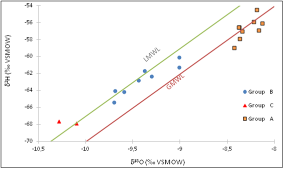 Generally, the spring waters in this mountain area are characterized by low mineralization.8 The Ifni lake is located at 2320m in this mountain area, mainly this lake and spring waters fed by atmospheric precipitation and snow. Ifni lake water characterized by 80µs/cm of conductivity, and 8.4 of pH. The water composition is rich in magnesium, calcium and bicarbonate ions. Isotopic data (Table 1) reveal the δ18O values of samples range from -8.13 (S5) to -10.28 (S22) vs‰ V-SMOW, whereas the δ2H values range from -55.89 (S6) to -67.83 (S8) vs‰ V-SMOW. The water sample collected from Ifni lake presents this isotopic content: δ18O=-8, 43 and δ2H=-59 ‰ (Table 1). The diagram (Figure 4) show the water samples plot compared to the global meteoric water line (GMWL),27 and local meteoric water line (LMWL).28 Usually, deviations in isotopic compositions away from meteoric water line may results from processes of evaporation.29‒31 The results (Figure 4) show that the most of water samples plot on (GMWL) and have isotopic signatures close to those of meteoric water, which explains that the origin of waters is meteoric and it was infiltrate directly. We can subdivide the water samples into three groups according to their isotopic signatures: