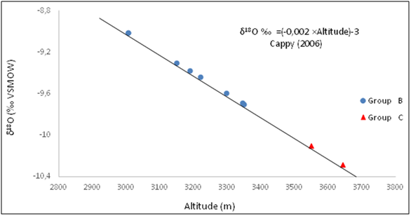 Figure 5 Relationship between δ18O in the water samples and their recharge elevation according with altitude gradient of Cappy.32