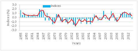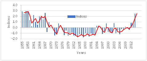 The calculation of rainfall and hydrometric indices makes it possible to identify major trends in time series. At the interannual level, they make it possible to highlight the deficit phases and the surplus phases. They are calculated from the following formula (equ.2):