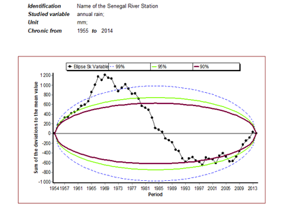 The average of the pre-rupture and post-rupture sub-series are 879.2 mm and 717.792 mm respectively, representing a rainfall deficit of 17% after the break. The 1955-1969 phase was in surplus. The average rainfall for this phase is 918 mm. During this phase, 1955 and 1965 were very rainy with 983.8 mm and 962.8 mm respectively. The 1970-2002 phase was very deficient with an average rainfall of 737.8 mm. The years 1983 and 1984 were particularly dry with respectively 626.6 and 584.4 mm of rainfall. The 2003-2014 phase was in surplus with an average rainfall of 843.1mm. The years 2003 and 2010 were particularly rainy with 937.9 and 932.6 mm of rain recorded respectively.