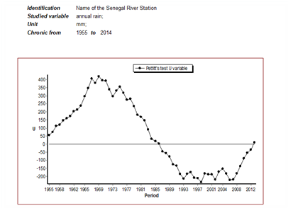 Over the period 1955-2014, rainfall in the upper basin is marked by very remarkable interannual fluctuations from one station to another. The statistical parameters are recorded in Table 2. There is a succession of surplus and deficit phases (Figure 3). The statistical analysis by the rank correlation test does not show any trend in the annual precipitation history. Figure 4 shows the results of applying the Buishand, and Pettitt tests shows the annual precipitation series on the Figure 5.