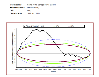 The Buishand test (Figure 7), the Pettitt test (Figure 8), the Hubert segmentation procedure do not reveal any breaks in the annual flow history. Only the Lee and Heghinian test shows a rupture in the annual flow chronicle in 1969. The mean values of the pre-break and post-break sub-series are 472.5m3/s and 157.4m3/s respectively, representing a hydrometric deficit of 66% after the rupture.