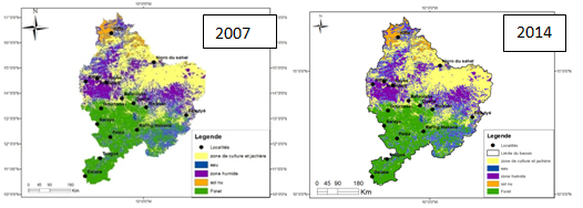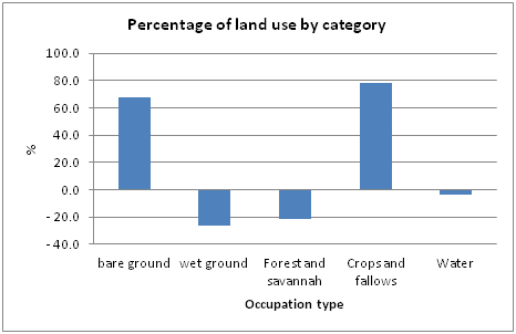 Land use in 2007 and 2014: From the analysis of the 2007 land use map (Figure 9) and Table 4, we note the following trends: predominance of forest and savannah, which represent 48% of the total area of the study area, wetlands with 23% and bare soils, which cover 13% of the area. Crop and fallow formations occupy 10% of the surface area and 6% of the water bodies. For the year 2014 (Figure 9), crops and fallows increased significantly to 17.8%, bare soils occupy 21.8% and 16.95% of the total area is occupied by wet soils, 5.8% by water bodies, and 37.65% by forests and savannas (Table 3).