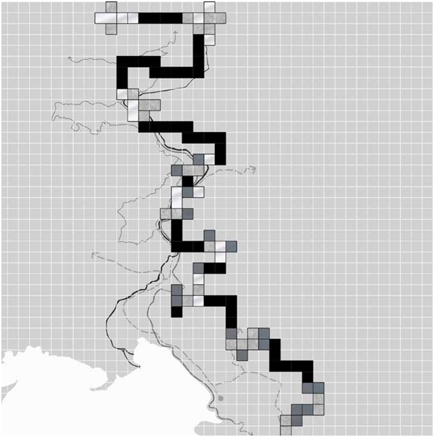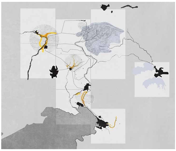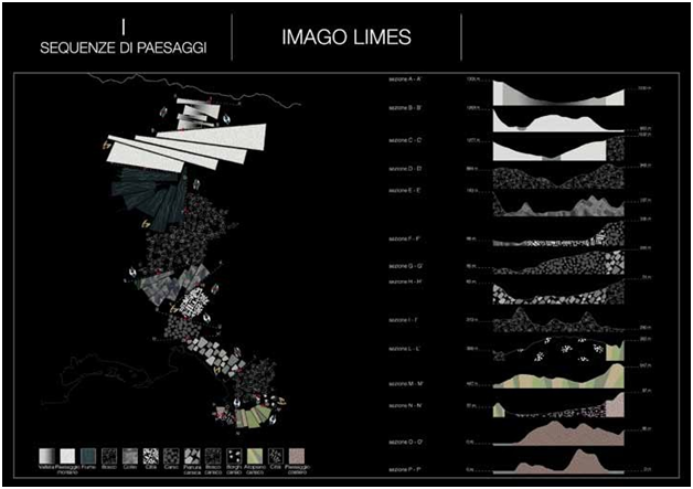 The research activity was divided in four phases. The first phase, immago limes, implied an analytical reconstruction of the territory’s structure, functioning, throughthe analysis of landscapes, systems (nature, settlements, infrastructures, etc.), fluxes, relations, historical evolution, current ongoing dynamics, obstacles/potential, through data gathering. During the second phase, visions, data were interpreted, summary models were elaborated, extended areas were identified for each segment of the border line, indicators were chosen, ecologies were defined, and thematisation was carried out through “narration”. The third phase, frammenti (fragments), implied the development of meta‒ projects concerning the overall thematisation and the identified obstacles/potential. These meta projects allowed for the focus on specific themes and places for the actual project. During the fourth and last phase, geo_graphies, all information, analytic and project elaborations and experiences were put together to elaborate the final deliverables: eleven ecologies, maps of change, border landscapes, the cross border ring, the city of the border and the new geography of the border (Figure 34&35).20‒23