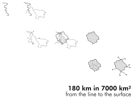 The research started from focusing on a border line that runs for 180km along the edge of 3States, 5regions, numerous landsca‒pes. Eventually, putting together the eleven visions elaborated by the working groups, an extended area of about 7000km2 was identified as the actual “region of the border”. This regions lays within a bigger cross‒border ring whose shape is defined by pieces of existing infrastructures, belonging to other systems, but representing, within the ring around the border, a “new” important infrastructure serving the territory. It also represents a functional unity, a perception system, in few words a whole structural unity for the region of the border.