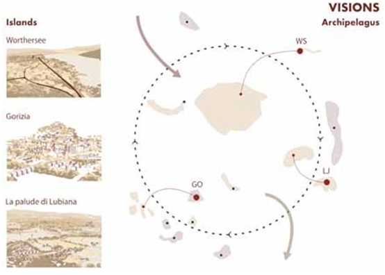 The research started from focusing on a border line that runs for 180km along the edge of 3States, 5regions, numerous landscapes. Eventually, putting together the eleven visions elaborated by the working groups, an extended area of about 7000km2 was identified as the actual “region of the border”. This regions lays within a bigger cross‒border ring whose shape is defined by pieces of existing infrastructures, belonging to other systems, but representing, within the ring around the border, a “new” important infrastructure serving the territory. It also represents a functional unity, a perception system, in few words a whole structural unity for the region of the border. The infrastructures taken into account for this new re‒shaping of the functionalities of the territory are highways A4 and A23 in Italy, E61 and E652 in Slovenia and A2 in Austria. Re‒interpreting the territory according to this ring structure, an original constellation of landscapes, natural systems, small centres, linear settlements and cities appears to the view and, with due care related to the still existing local and national fragmentations, they could be considered together as a whole, huge “border city” Figure 14.