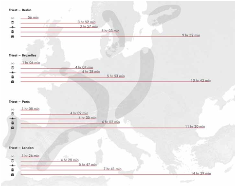 Figure 16 Development of the research team, students Matteo Ros, Milisa Stankovic, Enrico Vidulich. Timtable della regione transfrontaliera comparata con le principali mete europee. We are already contemplating the scenario of the hyperloop presented at the Architecture Biennale of Venice 2018.